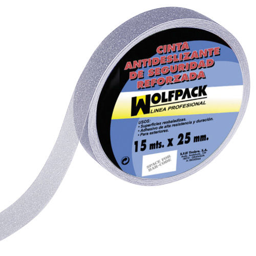 Cinta Antideslizante Transparente Wolfpack 15 m. x 25 mm. de uso doméstico. - Longitud x ancho: 15 metros x 25 mm. - Cintas antideslizantes autoadhesivas de alta calidad con superficie rugosa para evitar resbalar en zonas como escaleras, rampas, etc. - Transparente.