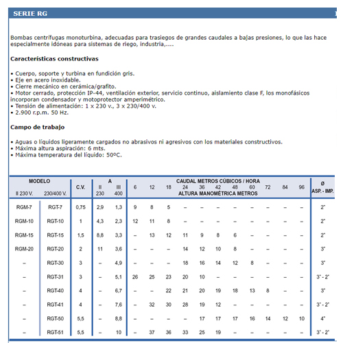 • Cuerpo, soporte y turbina en fundición gris. • Eje en acero inoxidable. • Cierre mecánico en cerámica/grafito. • Motor cerrado, protección IP-44, ventilación exterior, servicio continuo, aislamiento clase F, los monofásicos incorporan condensador y motoprotector amperimétrico. • Tensión de alimentación: 1 x 230 v., 3 x 230/400 v. • 2.900 r.p.m. 50 Hz. |