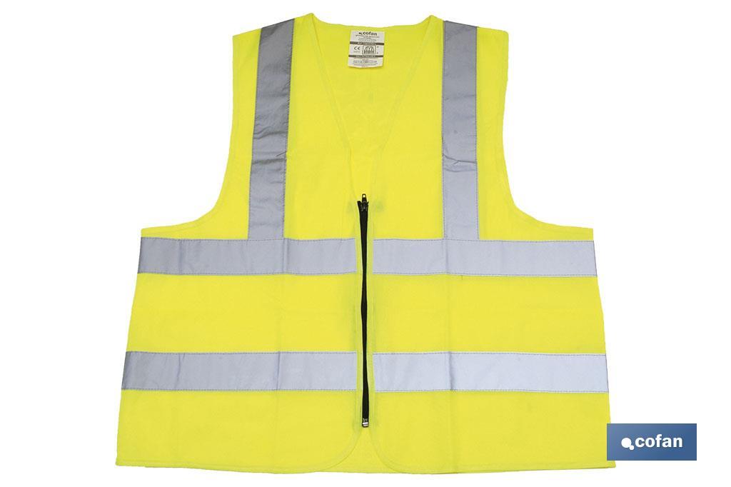 Chaleco de alta visibilidad con bandas reflectantes y cierre de cremallera, confeccionado con tejido de calada de color amarillo fluorescente. Destinado a señalizar en condiciones de riesgo bajo cualquier tipo de luz diurna y nocturna. La parte delantera de la prenda tiene una cremallera central y la parte inferior es de color amarillo. Bandas reflectantes rodeando el torso.