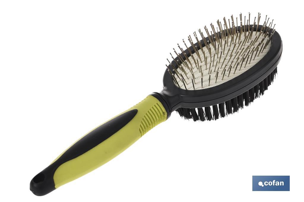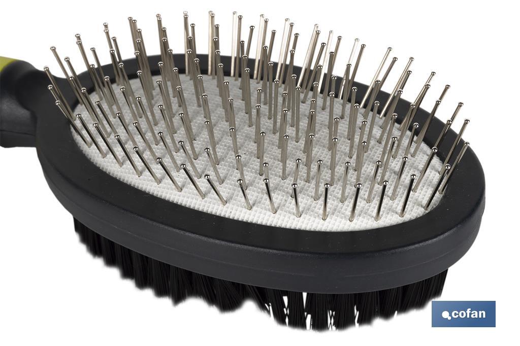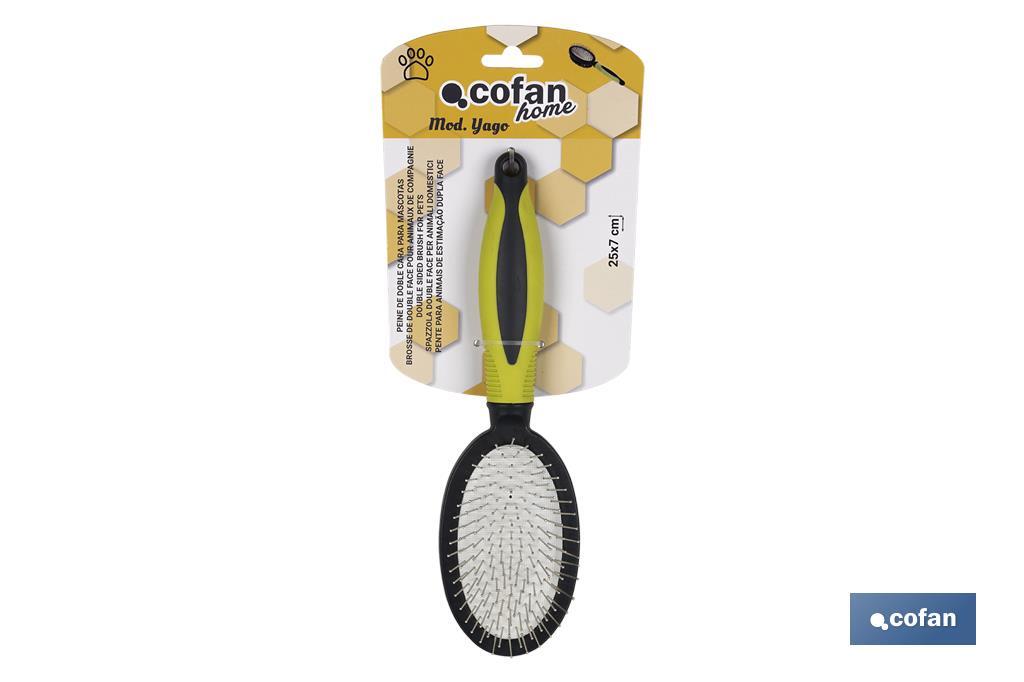Peine de doble cara para mascotas modelo Yago, un artículo esencial en la vida de cualquier mascota. Mantén el pelo de tu mascota siempre reluciente y sano. El cepillo está compuesto por un lado de alambre blando, con pasadores de punta redonda, ideales para eliminar enredos sin dañar su piel ni maltratar el pelaje. Además, favorece la circulación sanguínea de tu mascota. El otro lado del cepillo está compuesto por cerdas suaves, para eliminar el vello y dar brillo al pelaje. El mango está diseñado para minimizar el esfuerzo y ofrecer una mayor comodidad, mejorando la eficiencia del peine. Diseñado para uso en mascotas.