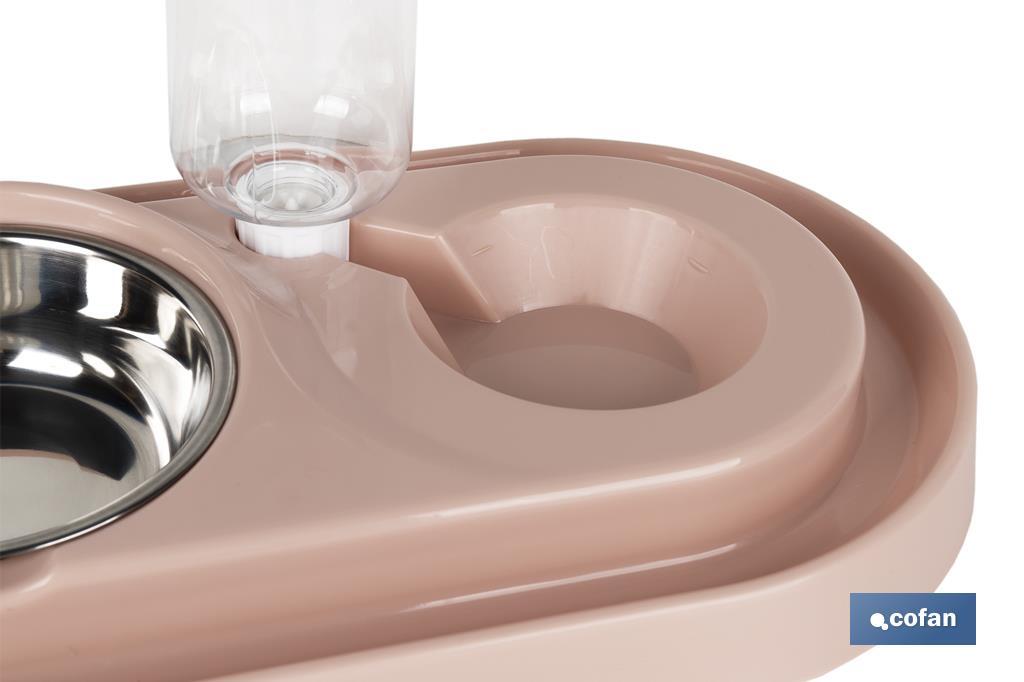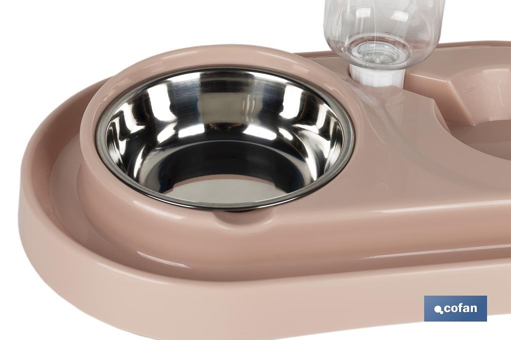 Dispensador de agua y comida para mascotas modelo Nala. Fabricado en polipropileno y acero de alta calidad y no tóxicos. El dispensador está equipado con un recipiente para alimentos y un recipiente para agua, además incluye una botella de agua con la que suministrar líquido a la mascota de forma regular. Con el dispensador podrás mantener a la mascota hidratada y saludable incluso aunque esté sola en casa. Gracias a su diseño de doble recipiente, sin esquinas muertas, es más fácil su limpieza y desinfección. Disponible en color nude con medidas de 40,5 x 3,5 x 23 cm.
