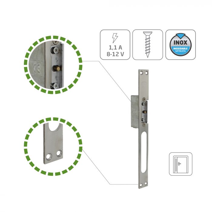 DETALLES: Incluye bobina de 8-12 V de corriente alterna. Amperaje: 1,1 A. Medidas: 250 x 25 x 3 mm. Fabricado en acero inoxidable 18/8, un material que destaca por su dureza, resistencia a la tracción y larga vida útil, además de ser uno de los metales que ofrece mayor resistencia frente al óxido y la corrosión.