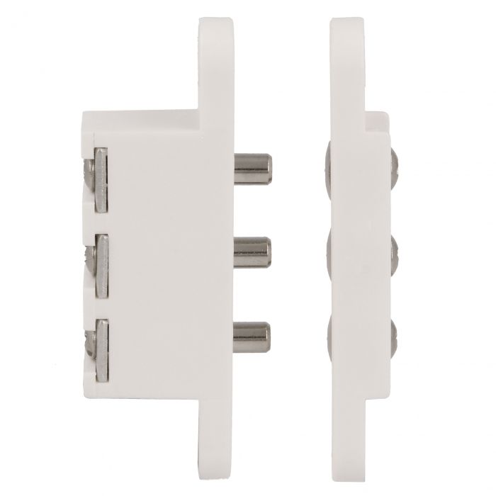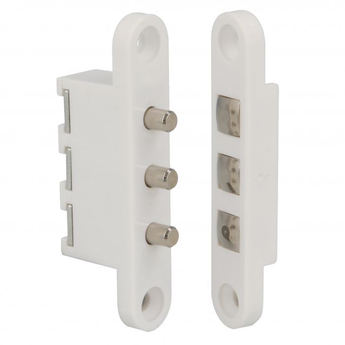 CONECTOR PASACORRIENTES DE 2 BORNES: Conector para pasar la corriente a través de puertas cerradas. Incluye 2 contactos de nylon blanco, uno para la hoja y otro para el marco de la puerta. Incluye tirafondos para su correcta instalación.