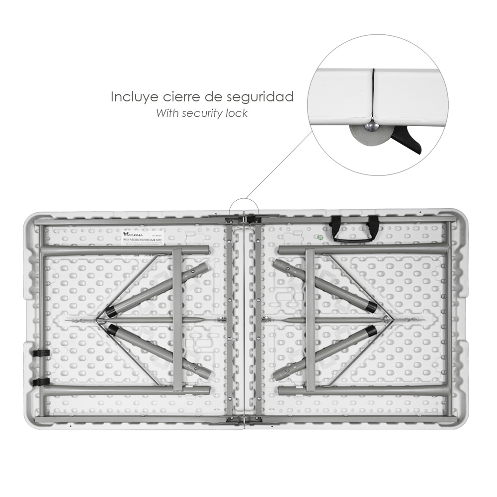 - Cuenta con cierre de seguridad para ajustar su total apertura y evitar que la mesa se cierre, Las patas también cuentan con sistema de seguridad, para que estas no se cierren de forma involuntaria,