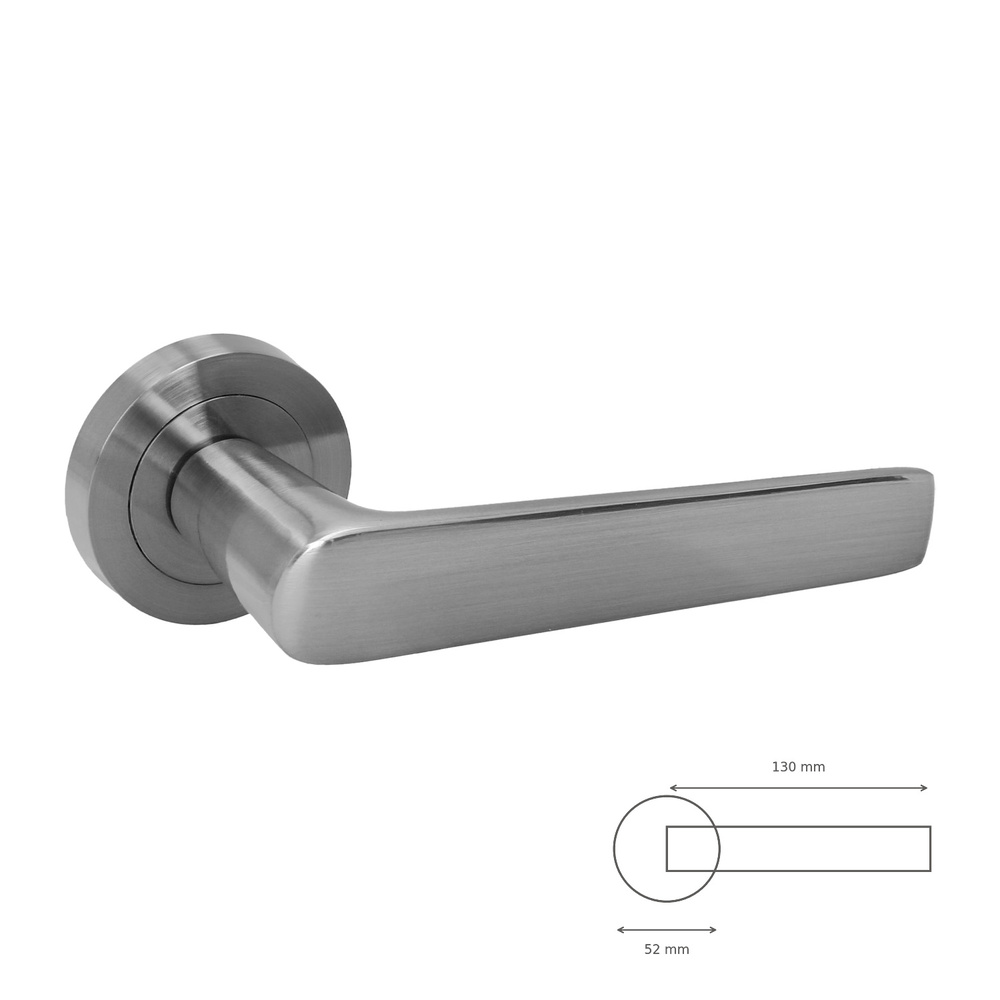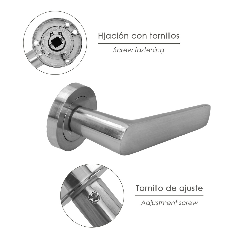 Juego Manillas Para Puertas "Ganges" - Modelo: roseta onda. - Realizado en metal. - Acabado: satinado. - Ideal para puertas interiores con un grosor entre 35 mm y 45 mm. - Diseño moderno y sencillo. - Incluye kit de instalación y fijación. - Artículo también conocido como manilla, juego manillas, manillas, manivela, manivelas, juego manivela, etc.