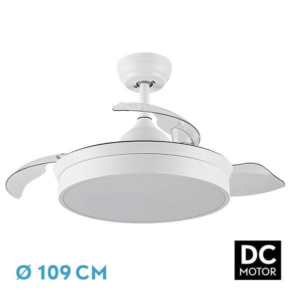 Ventilador DC serie CALA en color BLANCO con tres aspas DESPLEGABLES muy resistentes. Realizado en metal, ABS y policarbonato, con diseño moderno y elegante. Tiene seis velocidades ajustables. Motor DC. TecnologÃa LED integrada con una potencia de 72W, 3 TEMPERATURAS SELECCIONABLES DE LUZ (3000-4000-6000K), luz cálida, blanco natural y blanco frÃo, y 7200 lúmenes. Control de aire verano o invierno. Su medida es de 39/49x45 centÃmetros con las aspas plegadas y de 39/49x109 centÃmetros con las aspas desplegadas, con DOS MEDIDAS DE TIJA incluidas para colocar a distintas alturas. Mando a distancia INCLUIDO con MEMORIA DE COLOR incorporada y TEMPORIZADOR 1/2/4/8 H. Modelo disponible en dos tamaños y en color blanco, negro, nÃquel y cuero.
