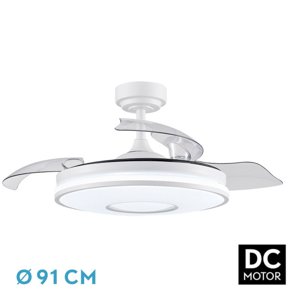 Ventilador DC serie DANI MINI realizado en metal, ABS y policarbonato, en color BLANCO con cuatro aspas DESPLEGABLES en ABS muy resistentes. Tiene seis velocidades ajustables. Motor DC. Tecnología LED integrada con una potencia de 59W, con 3 TEMPERATURAS SELECCIONABLES DE LUZ (3000-4000-6000K), luz cálida, natural y blanco frío, y 6980 lúmenes. Control de aire verano o invierno. Su medida es de 34,5/42X40 centímetros con las aspas plegadas y de 34,5/42X91 centímetros con las aspas desplegadas. Incluye dos tijas de 12,5 y 20 centímetros. Es REGULABLE EN INTENSIDAD con mando a distancia INCLUIDO, MEMORIA DE COLOR incorporada y TEMPORIZADOR 2/4 H. Modelo disponible en color blanco, níquel, negro, marrón y cuero, y también en dos tamaños.