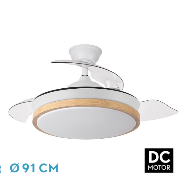 Ventilador DC de la serie EVROS realizado en metal, policarbonato y ABS, en color BLANCO/HAYA con tres aspas DESPLEGABLES de ABS transparente muy resistentes. Tiene seis velocidades ajustables. Tecnología LED integrada con una potencia de 72W, con 3 TEMPERATURAS SELECCIONABLES DE LUZ (3000-4000-6000K) y 6120 lúmenes. Control de aire verano o invierno. Su medida es de 32/47X40 centímetros con las aspas plegadas y de 32/47X91 centímetros con las aspas desplegadas. Incluye dos tijas de 10 y 25 centímetros, para colocar a distintas alturas. Mando a distancia INCLUIDO, con MEMORIA DE COLOR incorporada y TEMPORIZADOR 2/4 H. Disponibles en esta serie en blanco/haya y en negro/haya y en dos tamaños diferentes.