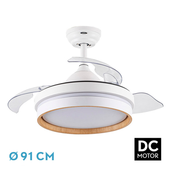 Ventilador DC de la serie NALON en color BLANCO/HAYA con tres aspas DESPLEGABLES muy resistentes. Realizado en metal, ABS y policarbonato. De diseño muy moderno y elegante, actualizando el modo de iluminar y ventilar cualquier estancia. Tiene seis velocidades ajustables. Motor DC. Tecnología LED integrada con una potencia de 48W, 4800 lúmenes y 3 TEMPERATURAS SELECCIONABLES DE LUZ (3000-4500-6000K), luz cálida, blanco natural y blanco frío. Control de aire verano o invierno. Tiene unas dimensiones de 40/50x40x40 centímetros con las aspas plegadas y de 40/50x91x91 centímetros con las aspas desplegadas, con DOS MEDIDAS DE TIJA incluidas para colocar a distintas alturas. Mando a distancia INCLUIDO con MEMORIA DE COLOR incorporada y TEMPORIZADOR 1/2/4/8 H. Modelo disponible en dos tamaños y en color blanco, negro/oro, blanco/haya y negro/madera oscura.