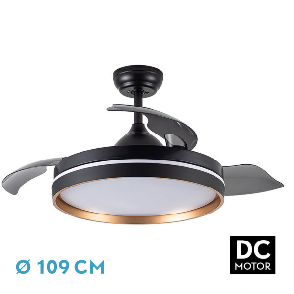 Ventilador DC de la serie NALON en color NEGRO/ORO con tres aspas DESPLEGABLES muy resistentes. Realizado en metal, ABS y policarbonato. De diseño muy moderno y elegante, actualizando el modo de iluminar y ventilar cualquier estancia. Tiene seis velocidades ajustables. Motor DC. Tecnología LED integrada con una potencia de 72W, 7200 lúmenes y 3 TEMPERATURAS SELECCIONABLES DE LUZ (3000-4500-6000K), luz cálida, blanco natural y blanco frío. Control de aire verano o invierno. Tiene unas dimensiones de 40/50x48x48 centímetros con las aspas plegadas y de 40/50x109x109 centímetros con las aspas desplegadas, con DOS MEDIDAS DE TIJA incluidas para colocar a distintas alturas. Mando a distancia INCLUIDO con MEMORIA DE COLOR incorporada y TEMPORIZADOR 1/2/4/8 H. Modelo disponible en dos tamaños y en color blanco, negro/oro, blanco/haya y negro/madera oscura.