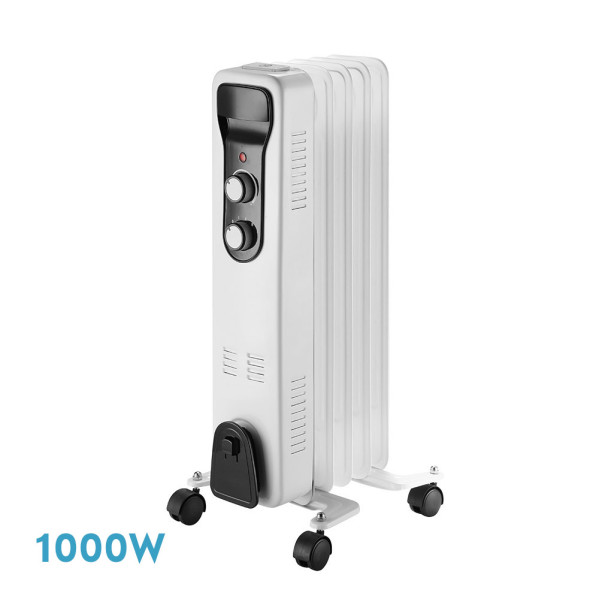Radiador de Aceite eléctrico de la serie BRASILIA en color BLANCO/NEGRO. Realizado en metal y ABS. Equipado con 1000 watios de potencia repartidos en sus 5 elementos calefactores, que permiten calentar eficazmente y con bajo consumo cualquier estancia. Con tres potencias seleccionables, 400w/600w/1000w para elegir, dependiendo del espacio y la rapidez con la que desea se caliente la estancia, viene con control de Termostato Ajustable, sistema de protección sobrecalentamiento, SISTEMA ANTIVUELCO y luz indicadora de encendido. Se presenta con un diseño fácil de transportar gracias a su asa y a sus ruedas para facilitar el desplazamiento. Con un útil soporte en su estructura para enrollar el cable. Tiene unas dimensiones de 59,5x25,5x24 centímetros. Disponible en esta serie de 1000w, 1500w, 2000w y 2500w de máxima potencia con sus respectivos tamaños.