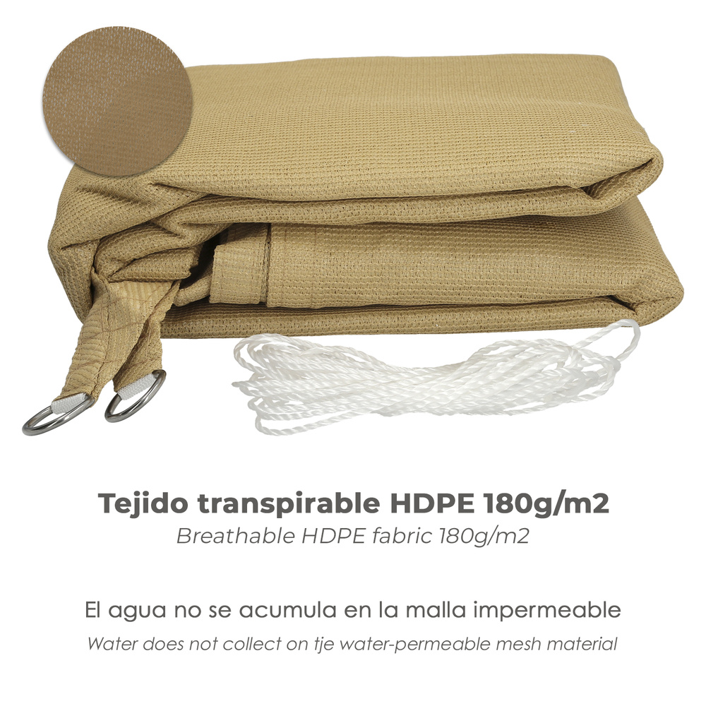 Toldo Vela Sombra Jardin Triangular - Color: Beige - Medidas: 3,6 x 3,6 metros. - Realiza en material transpirable HDPE 180 gr/m2. - Protege del sol y de los rayos UV. - Esta equipada con anillas en forma "D" (de 5 mm.) en cada esquina. - Elementos de fijación (6 mm. x 1.5 metros). - Refuerzo lateral de 2.5 cm. con borde ribeteado. - Uso domestico. - Artículo también conocido como toldo, toldos, toldo vela, toldo vela sombra, protección rayos, toldo transpirable, protección UV, protección solar, toldo jardín, etc.