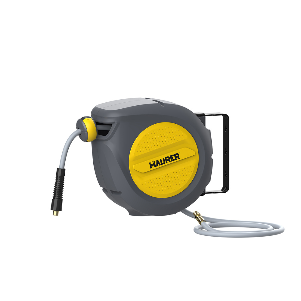 Porta Mangueras Tubo Aire Comprimido - Longitud manguera: 9 metros. - Longitud manguera entrada de aire: 1 metro. - Manguera de Ø 8 mm. - Soporte para la pared giratario 180º realizado en metal. - Incluye conectores rapidos de manguera. - Articulo conocido como enrollador manguera, recogedor manguera aire, enrollador manguera, manguera compresor, manguera aire neumatica.