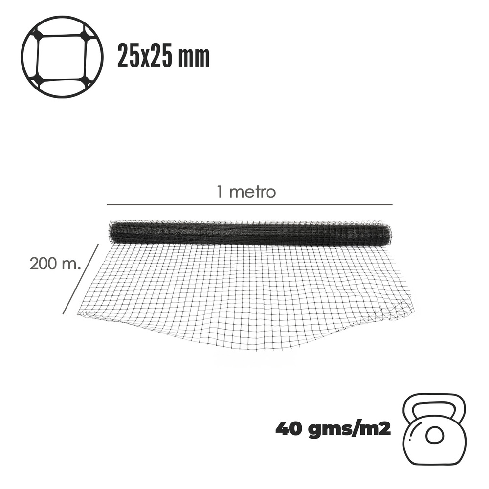 Malla Protectora Avicola BOP - Medidas: 25 x 25 mm. / 1 m. x 200 m. - 40gms/m2. - Muy resistente y ligera. - Tratada con aditivos anti-UV. - No necesita mantenimiento. - Ideal para la construcción de gallineros y jaulas para aves, así como otras aplicaciones en el jardín. - Artículo también conocido como malla protectora, malla negra, malla tejida, protege plantas, protectos plantas, protector arboles, protector arboles frutales, protector árbol, protector malla, etc.